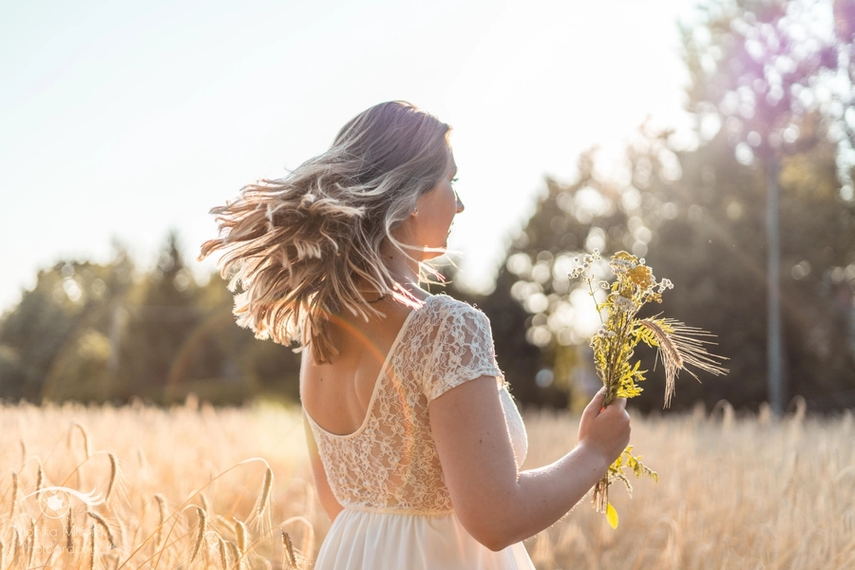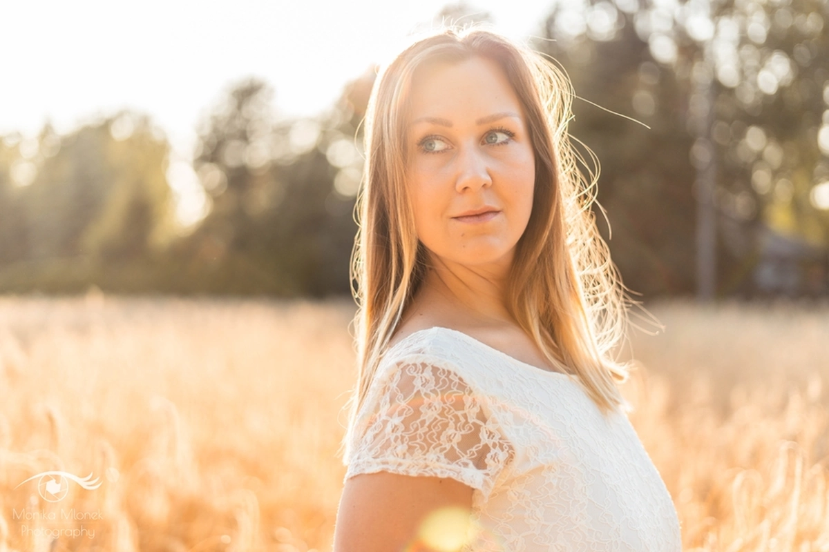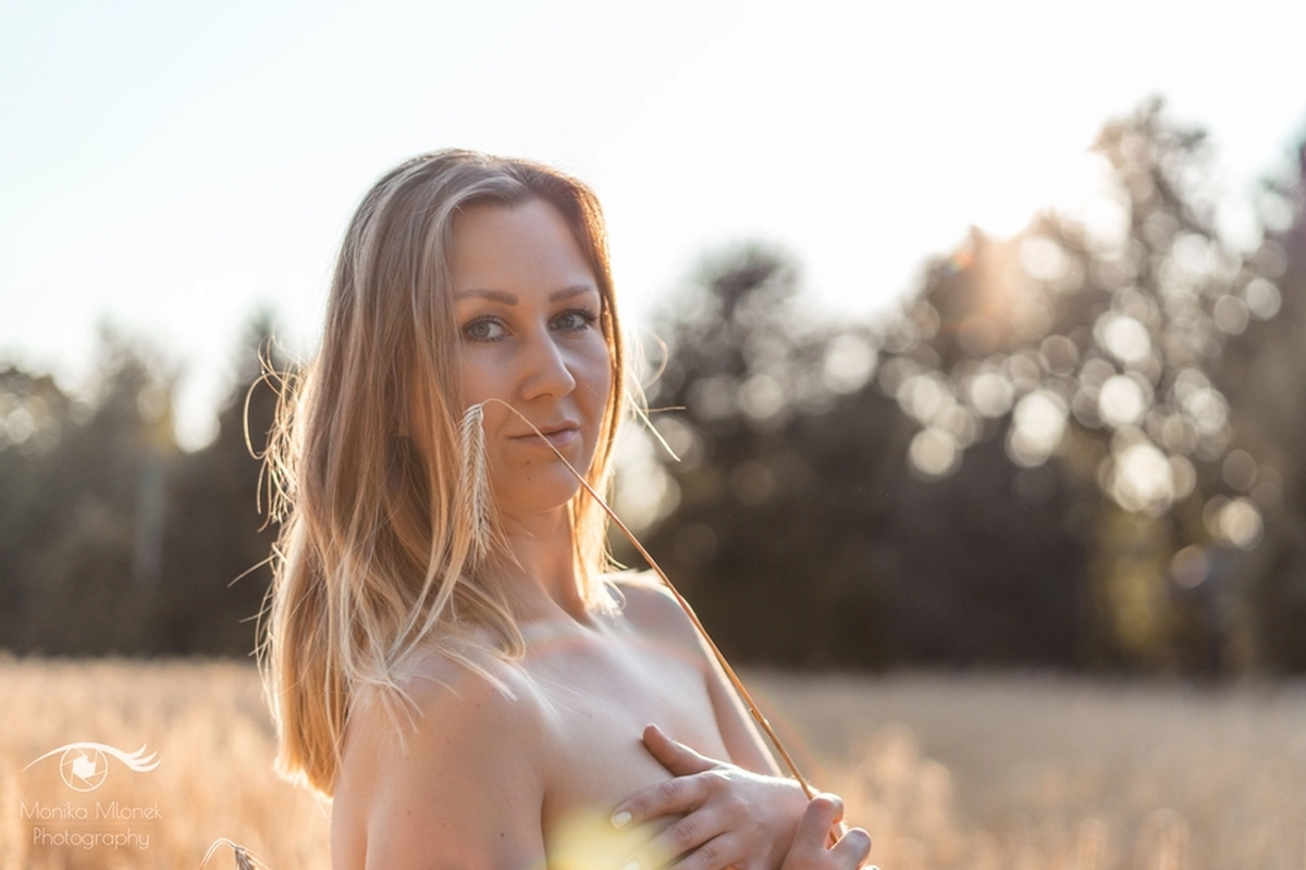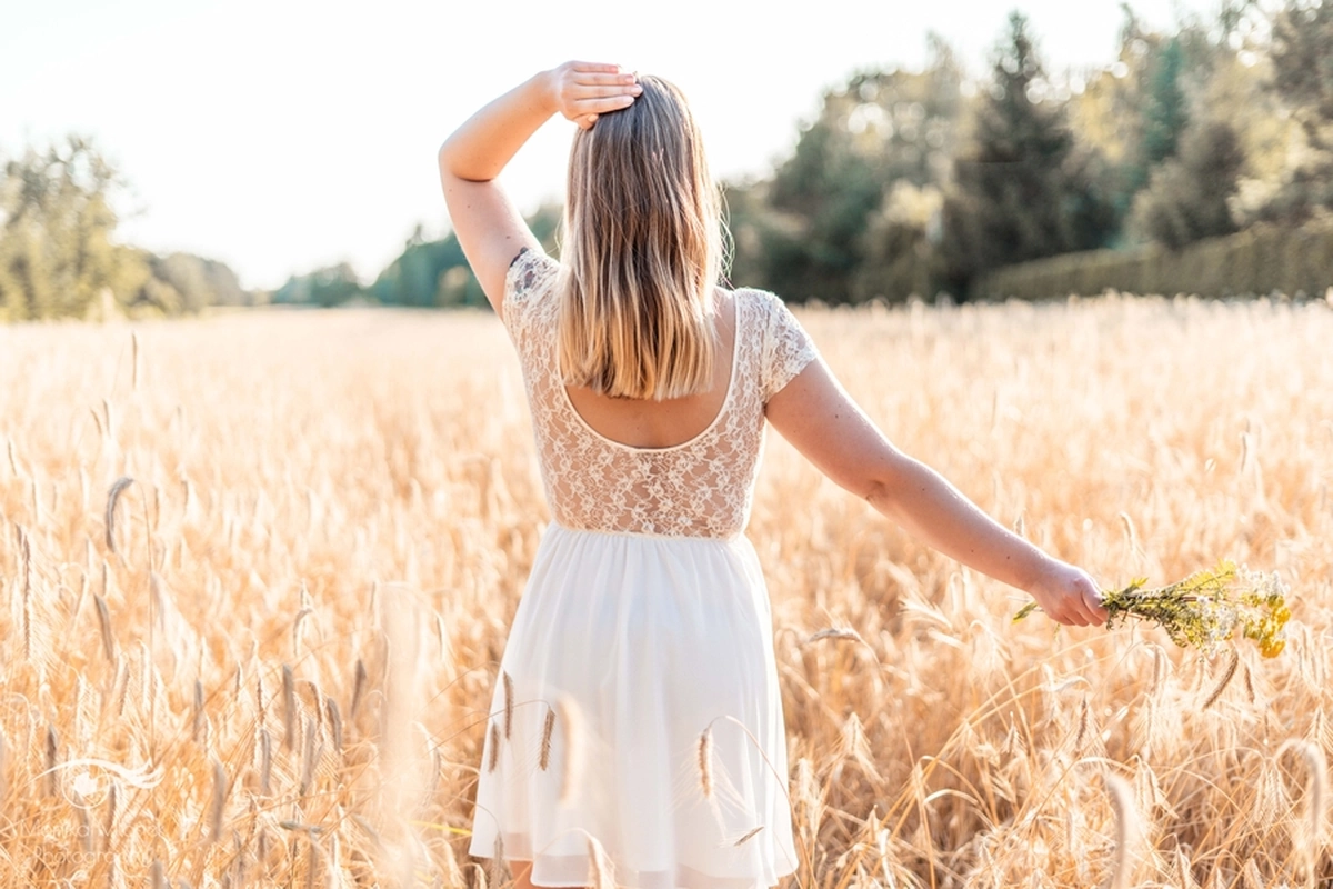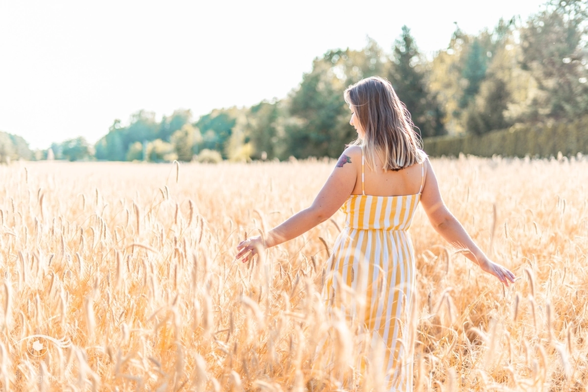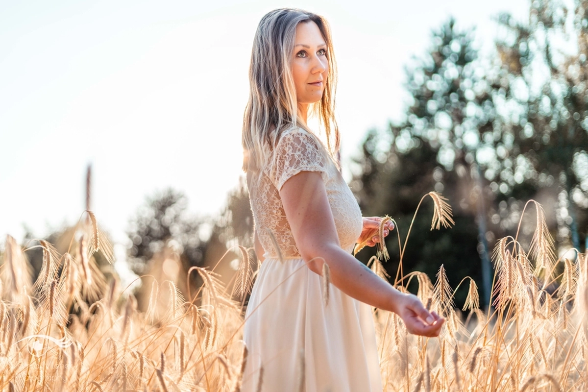 Lubię chodzić na spacery i jeździć rowerem w mniej zaludnionych obszarach, właśnie tak znalazłam miejsce na tą sesję. Przechodziłam obok pola, zobaczyłam piękne zboże i od razu wiedziałam, że chcę tam wykonać zdjęcia. Poszukałam osoby chętnej na sesję. w ciągu trzech dni napisała do mnie koleżanka Marta. Rozpoczęłam od razu przygotowania. Wszytko ustaliłam, najmniejsze szczegóły, makijaż, ubrania, rekwizyty. Na wyznaczonym miejscu spotkałyśmy się tuż przed złotą godziną. Marta, pomimo braku doświadczenia w modelingu, była bardzo naturalna i odważna, dzięki czemu sesja przebiegła bardzo szybko i sprawnie. Miałam ze sobą trzy sukienki do zmiany stylizacji dla Marty i mały bukiet z polnych kwiatów. Podczas sesji towarzyszyła nam muzyka, myślę, że praca z muzyką tworzy luźniejszą atmosferę i pomaga kreatywności. Przechodzący ludzie pozytywnie odbierali moją twórczość, uśmiechali się do nas i pytali o sesję ?