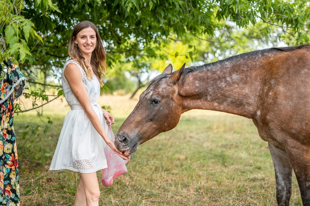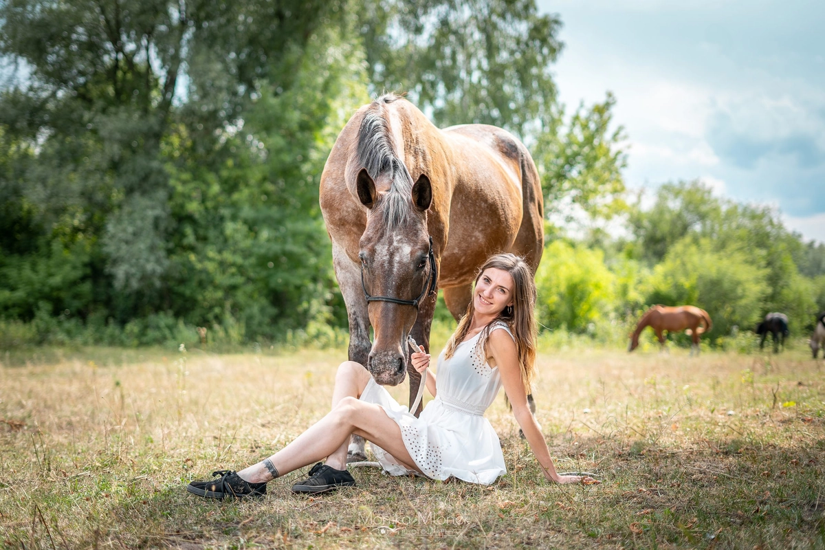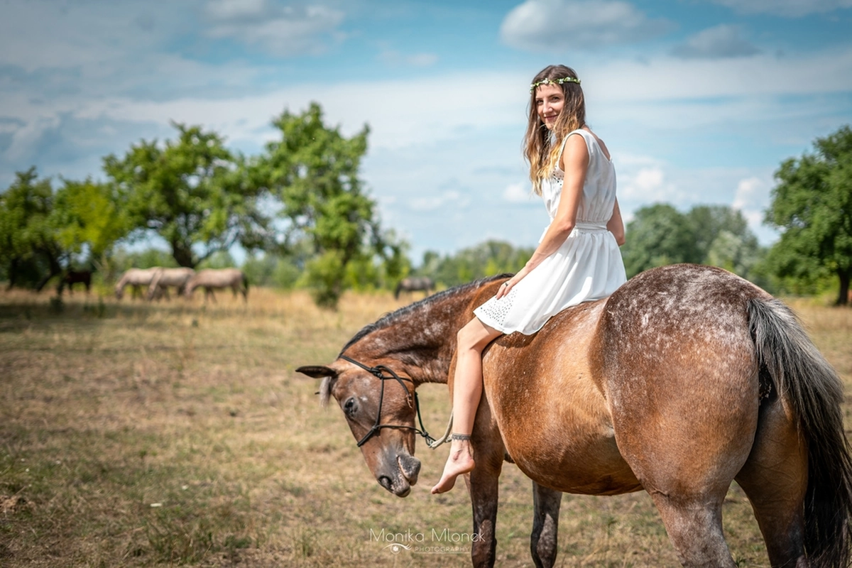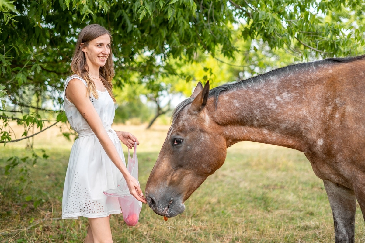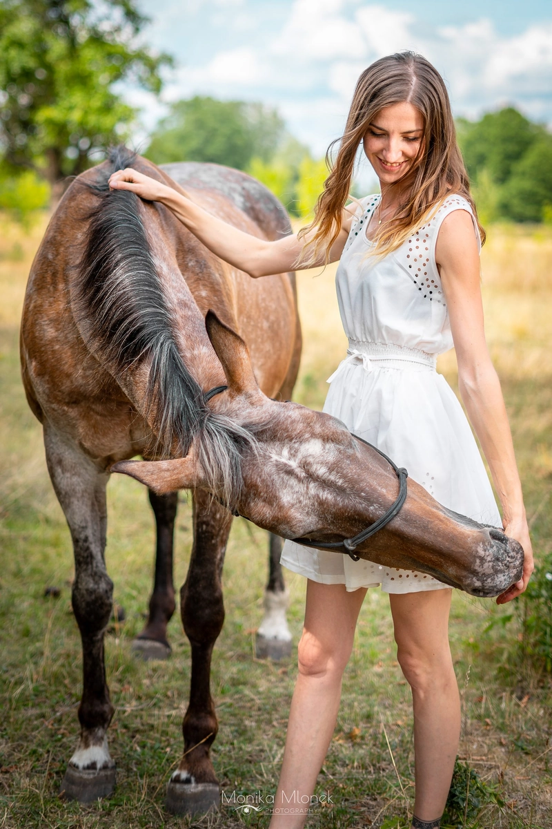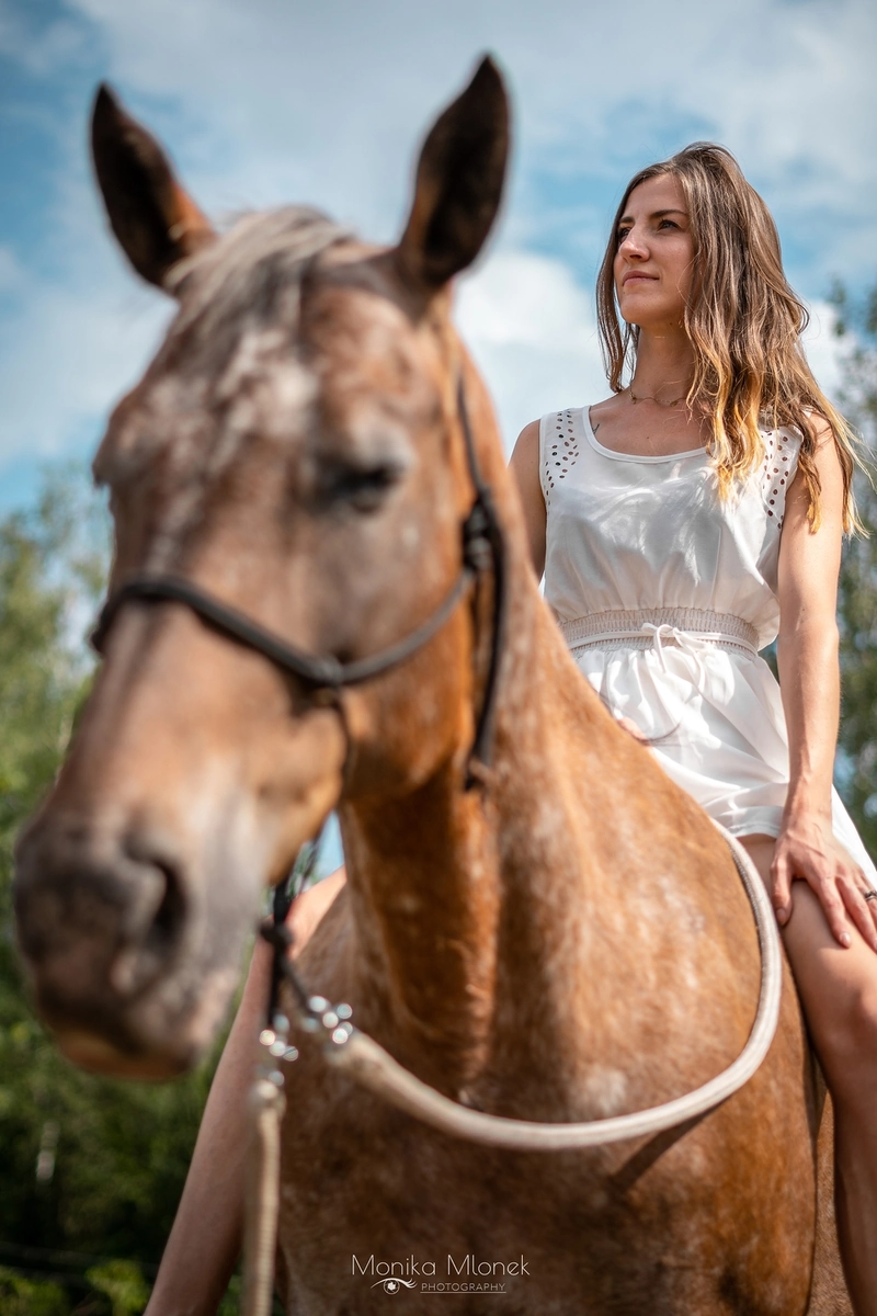 Moja koleżanka Marta trzyma swoją klacz w przydomowej stajni, gdzie w okolicy jest kilka domów i ogromne pola. Kiedy zaproponowałam sesję zdjęciową, od razu była chętna. Długo zgrywałyśmy wolne terminy i w końcu się udało. W dniu sesji była piękna słoneczna pogoda (udało mi się zabrać asystenta do pomocy), przyjechaliśmy na miejsce, Marta poszła wyczyścić konia, ja rozejrzałam się po okolicy, żeby znaleźć najlepsze miejsce na zdjęcia, a asystent rozkładał sprzęt (aparat, blenda). Stwierdziłyśmy z Martą, że łąka, na której były puszczone wszystkie konie, będzie dodawać fajnego klimatu „wolności” i właśnie tam zrobiłyśmy zdjęcia. Marta założyła białą sukienkę, wzięłyśmy Hanię i chciałyśmy kawałek odejść od koni, ale kiedy zaczęłyśmy iść, pozostałe konie zaczęły iść za nami. Podczas zdjęć, w pewnych momentach konie podchodziły do nas, przeszkadzały i zaczepiały Hanie, ale dzięki pomocy asystenta, który odganiał stado, ja mogłam swobodnie robić zdjęcia. Marta była uśmiechnięta, pozytywnie nastawiona, za to Hania odmawiała współpracy na wszystkie sposoby, chociaż często zmieniała zdanie po kawałku marchewki czy jabłka. Sesja trwała około godziny, zrobiłam bardzo dużo ujęć, wszyscy byli zadowoleni, skończyliśmy, spakowałam się, a po powrocie do domu zaczęłam przebierać zdjęcia.