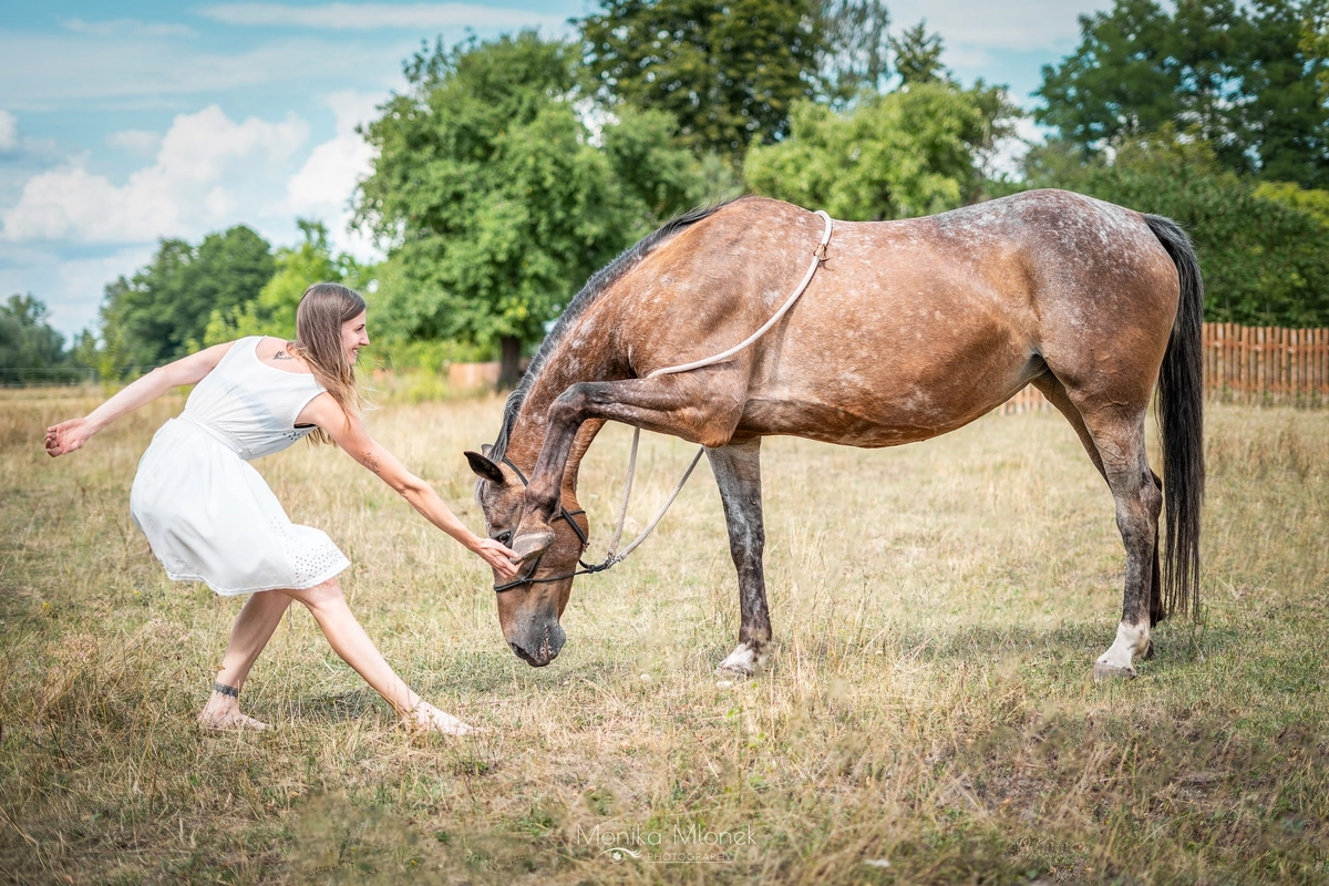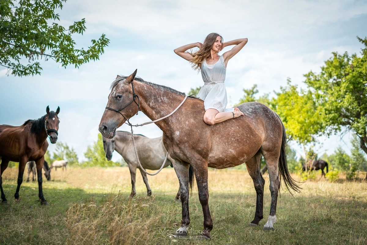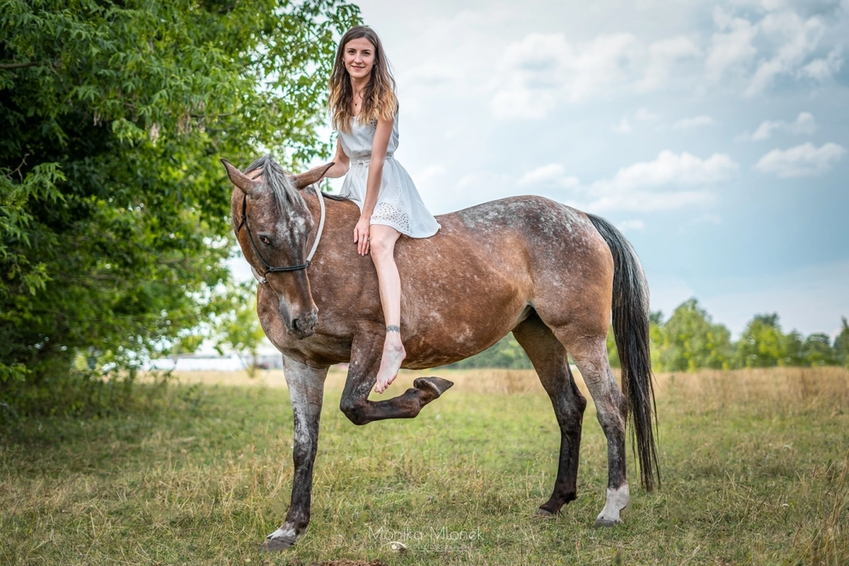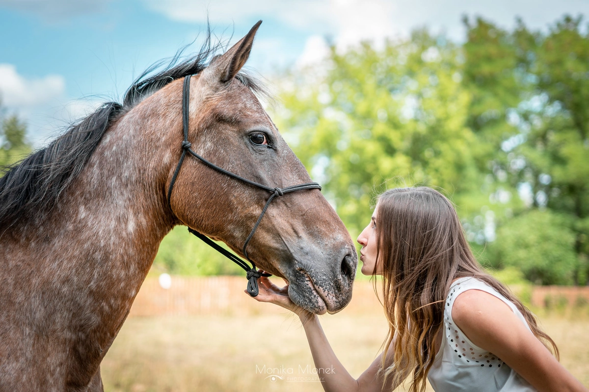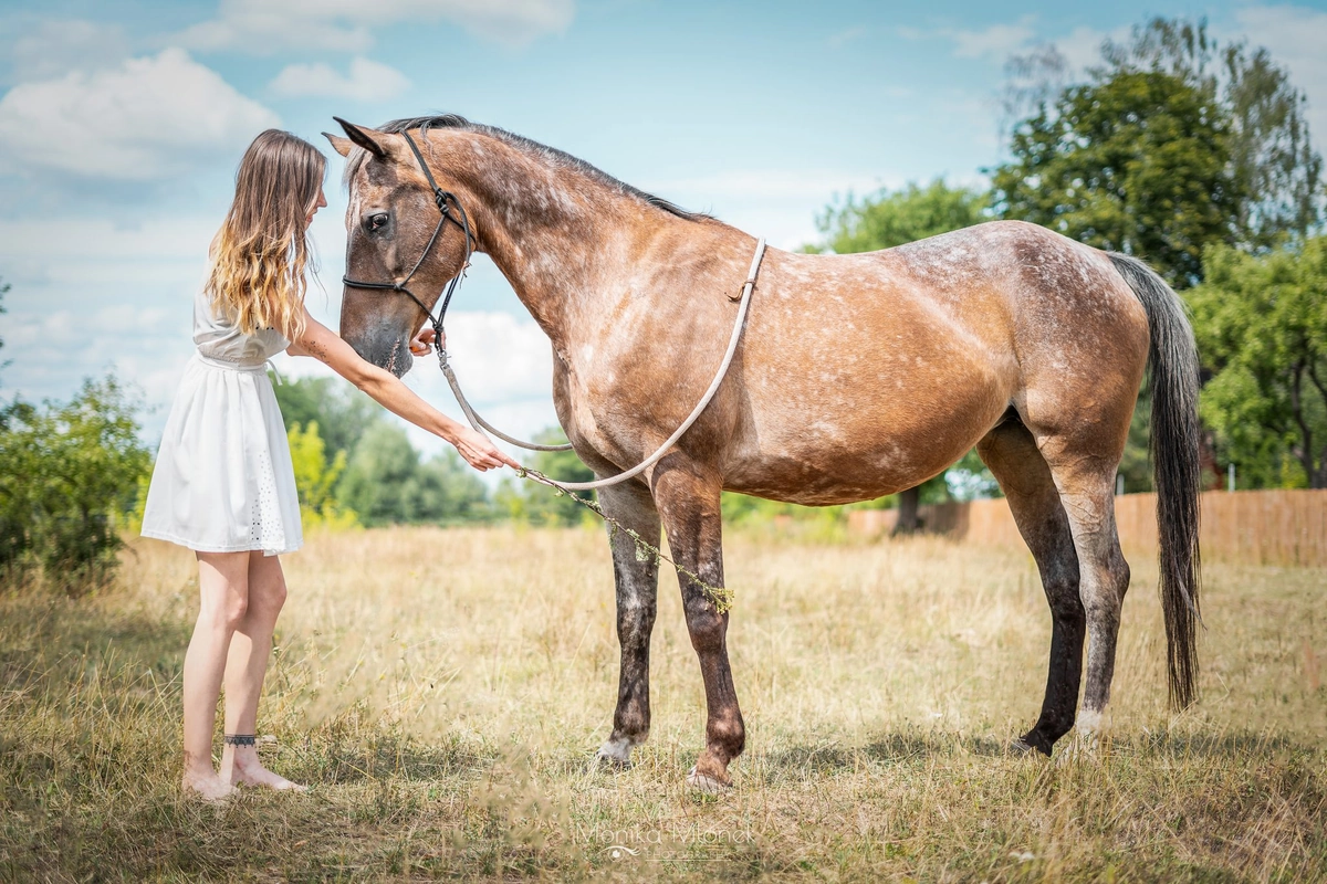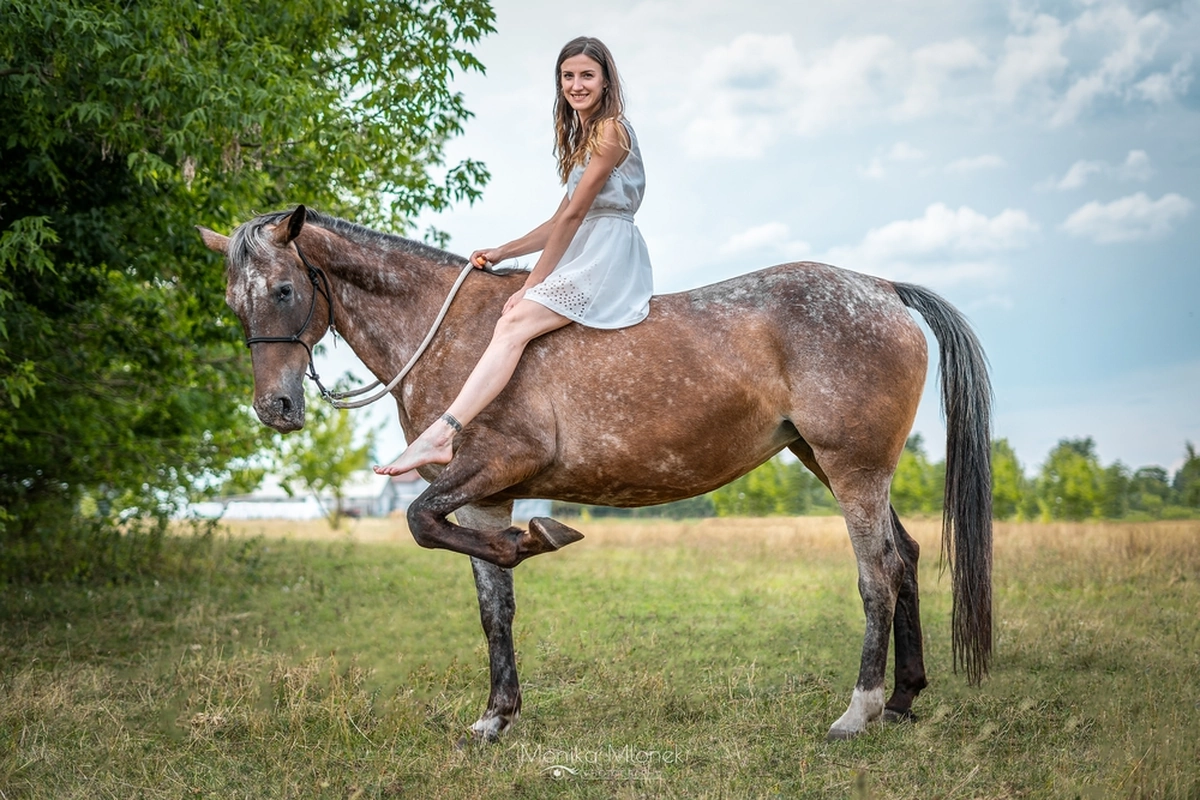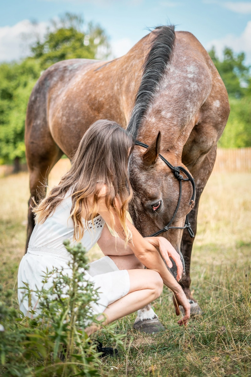 Moja koleżanka Marta trzyma swoją klacz w przydomowej stajni, gdzie w okolicy jest kilka domów i ogromne pola. Kiedy zaproponowałam sesję zdjęciową, od razu była chętna. Długo zgrywałyśmy wolne terminy i w końcu się udało. W dniu sesji była piękna słoneczna pogoda (udało mi się zabrać asystenta do pomocy), przyjechaliśmy na miejsce, Marta poszła wyczyścić konia, ja rozejrzałam się po okolicy, żeby znaleźć najlepsze miejsce na zdjęcia, a asystent rozkładał sprzęt (aparat, blenda). Stwierdziłyśmy z Martą, że łąka, na której były puszczone wszystkie konie, będzie dodawać fajnego klimatu „wolności” i właśnie tam zrobiłyśmy zdjęcia. Marta założyła białą sukienkę, wzięłyśmy Hanię i chciałyśmy kawałek odejść od koni, ale kiedy zaczęłyśmy iść, pozostałe konie zaczęły iść za nami. Podczas zdjęć, w pewnych momentach konie podchodziły do nas, przeszkadzały i zaczepiały Hanie, ale dzięki pomocy asystenta, który odganiał stado, ja mogłam swobodnie robić zdjęcia. Marta była uśmiechnięta, pozytywnie nastawiona, za to Hania odmawiała współpracy na wszystkie sposoby, chociaż często zmieniała zdanie po kawałku marchewki czy jabłka. Sesja trwała około godziny, zrobiłam bardzo dużo ujęć, wszyscy byli zadowoleni, skończyliśmy, spakowałam się, a po powrocie do domu zaczęłam przebierać zdjęcia.