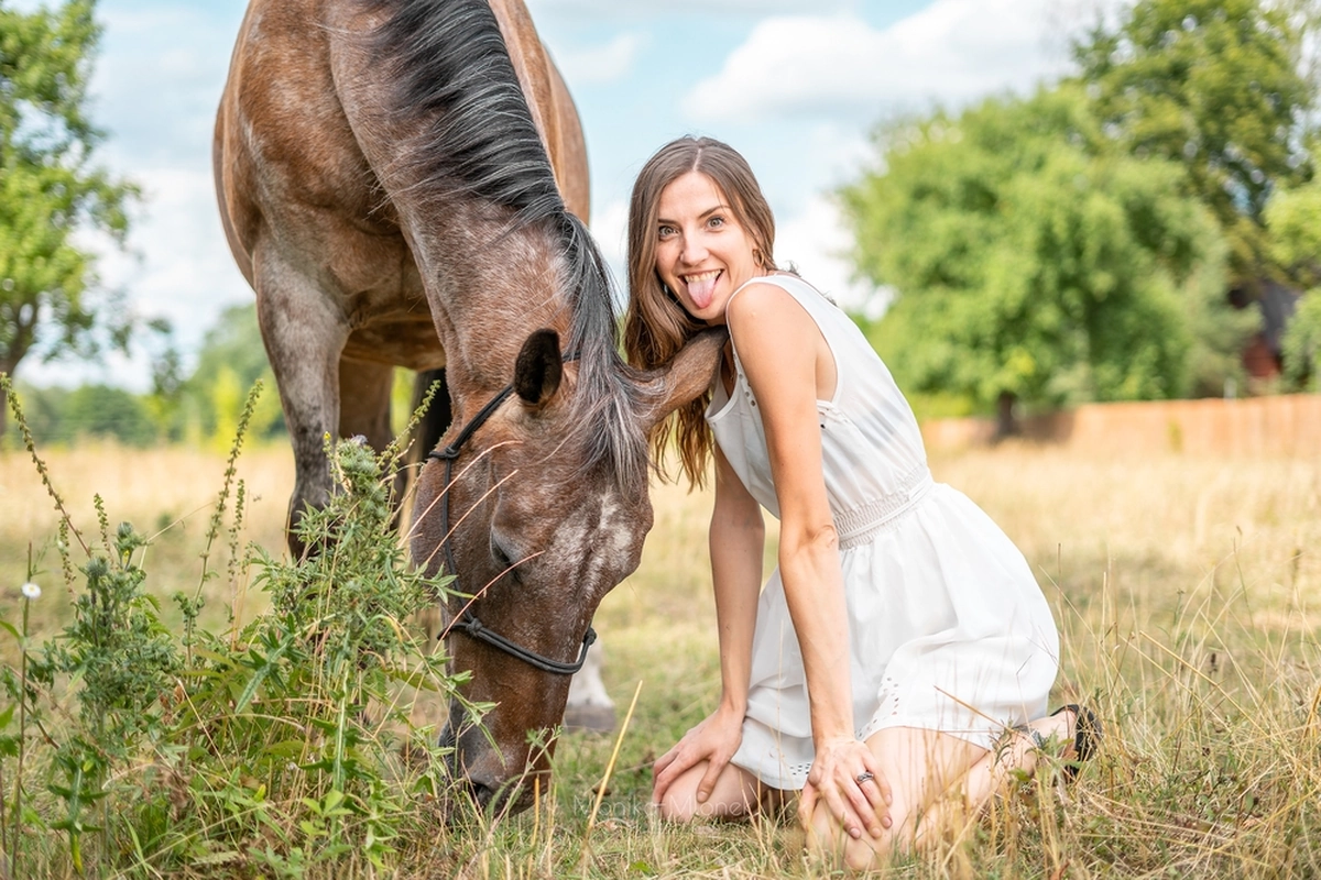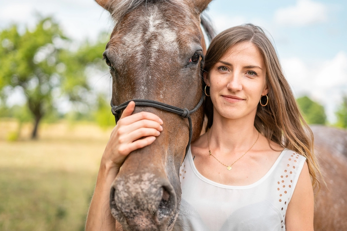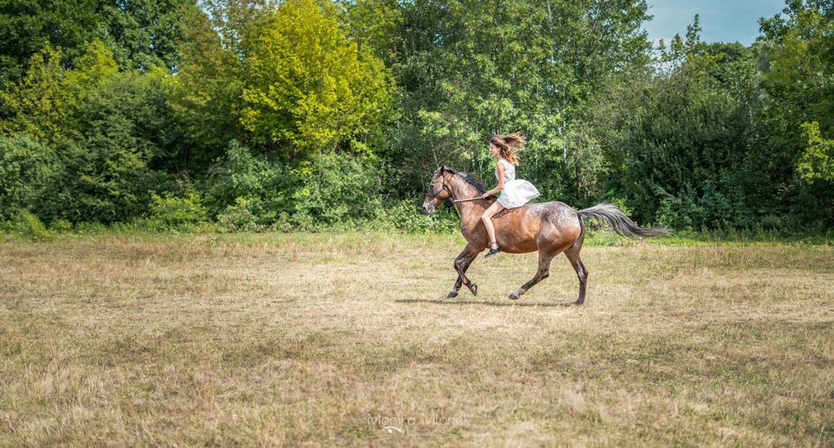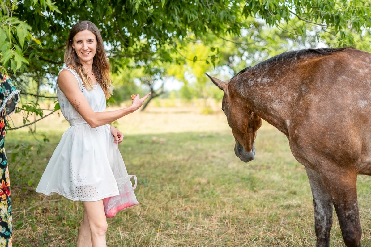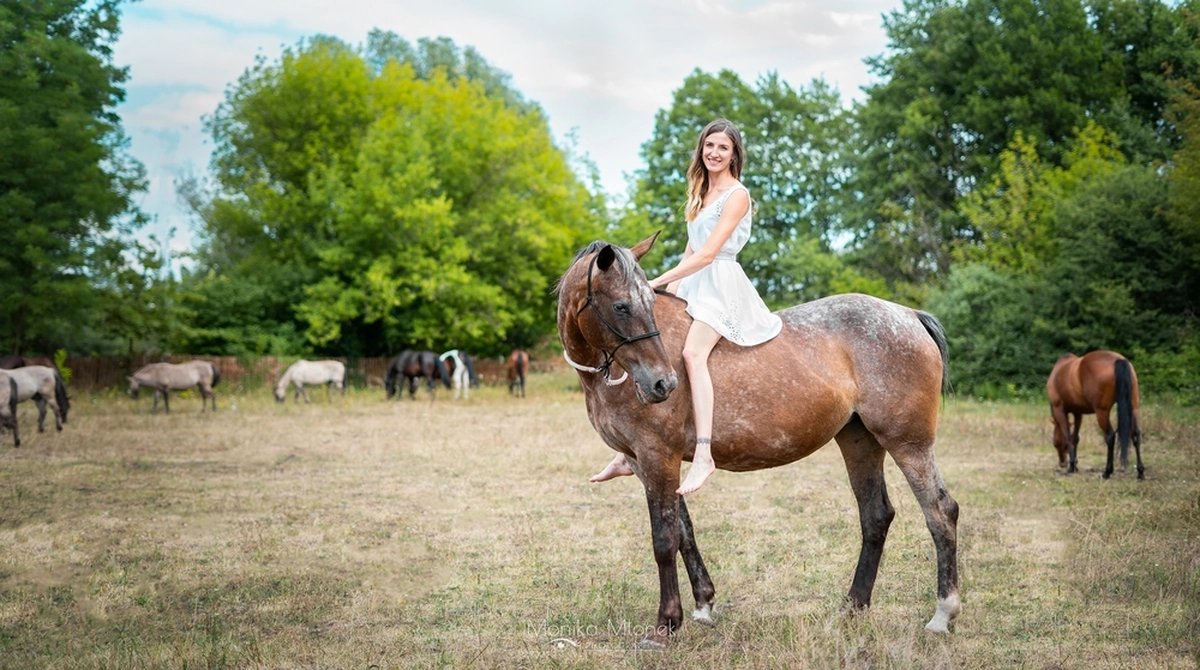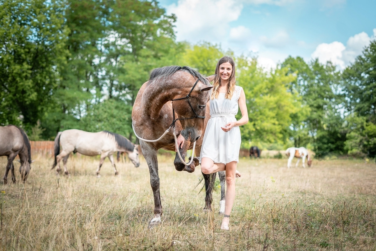 Moja koleżanka Marta trzyma swoją klacz w przydomowej stajni, gdzie w okolicy jest kilka domów i ogromne pola. Kiedy zaproponowałam sesję zdjęciową, od razu była chętna. Długo zgrywałyśmy wolne terminy i w końcu się udało. W dniu sesji była piękna słoneczna pogoda (udało mi się zabrać asystenta do pomocy), przyjechaliśmy na miejsce, Marta poszła wyczyścić konia, ja rozejrzałam się po okolicy, żeby znaleźć najlepsze miejsce na zdjęcia, a asystent rozkładał sprzęt (aparat, blenda). Stwierdziłyśmy z Martą, że łąka, na której były puszczone wszystkie konie, będzie dodawać fajnego klimatu „wolności” i właśnie tam zrobiłyśmy zdjęcia. Marta założyła białą sukienkę, wzięłyśmy Hanię i chciałyśmy kawałek odejść od koni, ale kiedy zaczęłyśmy iść, pozostałe konie zaczęły iść za nami. Podczas zdjęć, w pewnych momentach konie podchodziły do nas, przeszkadzały i zaczepiały Hanie, ale dzięki pomocy asystenta, który odganiał stado, ja mogłam swobodnie robić zdjęcia. Marta była uśmiechnięta, pozytywnie nastawiona, za to Hania odmawiała współpracy na wszystkie sposoby, chociaż często zmieniała zdanie po kawałku marchewki czy jabłka. Sesja trwała około godziny, zrobiłam bardzo dużo ujęć, wszyscy byli zadowoleni, skończyliśmy, spakowałam się, a po powrocie do domu zaczęłam przebierać zdjęcia.