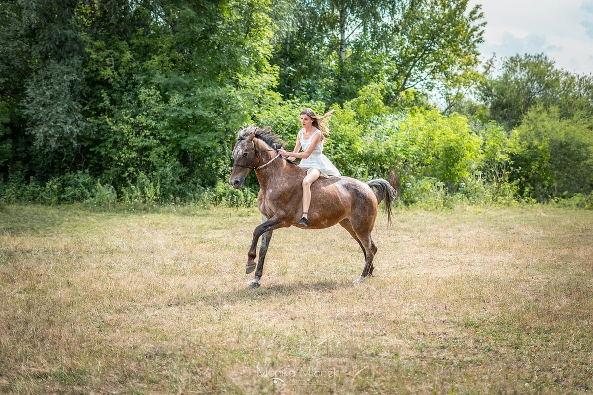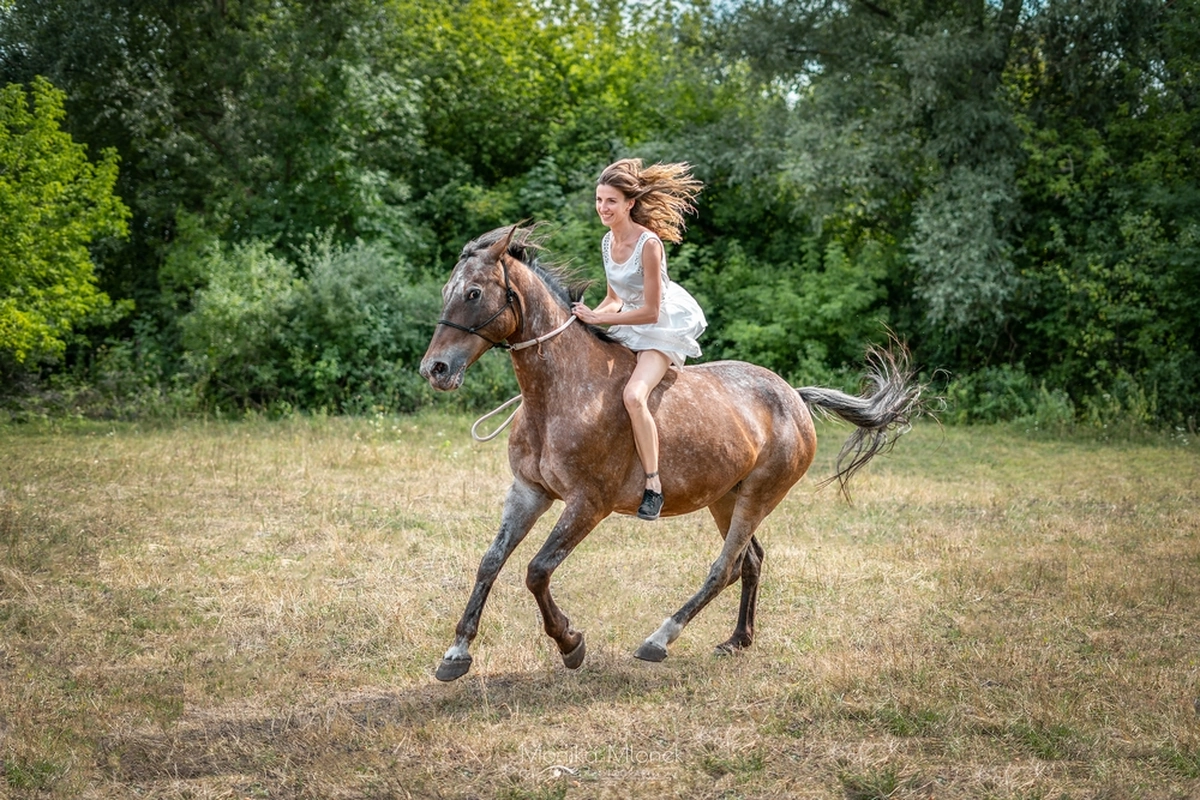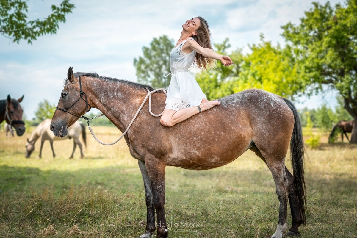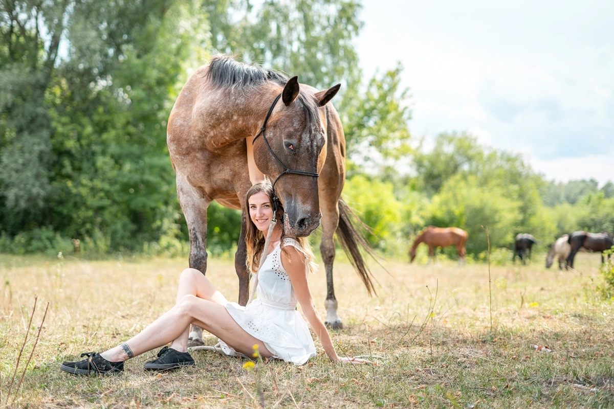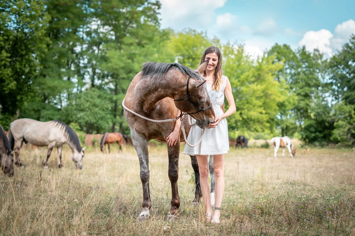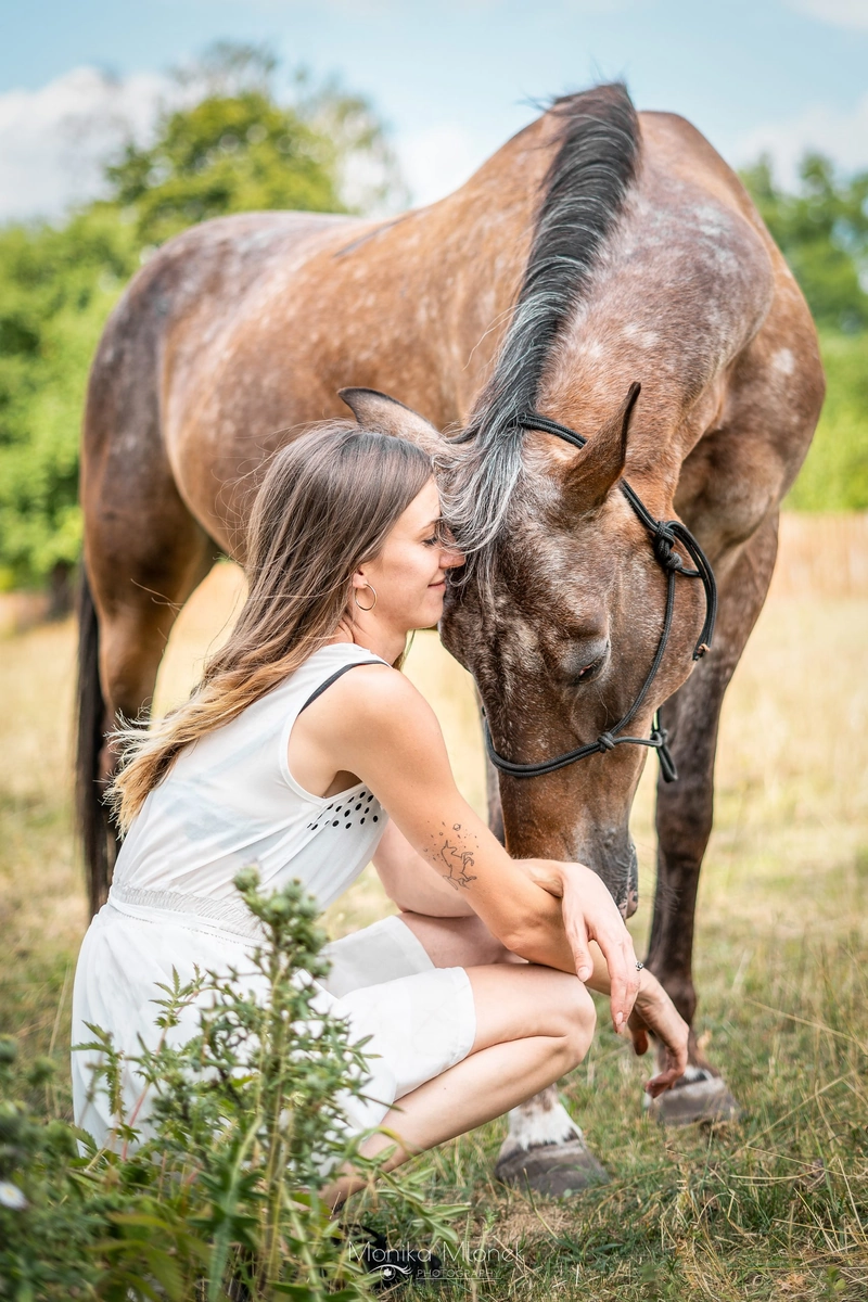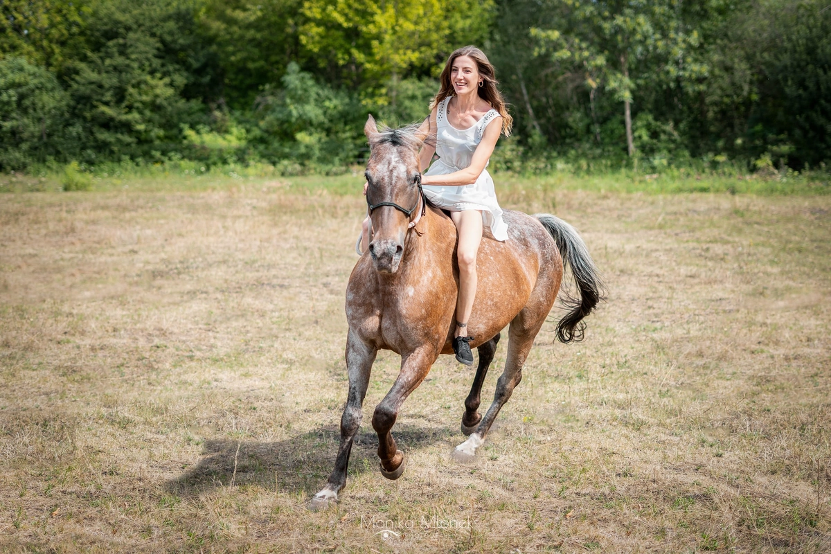 Moja koleżanka Marta trzyma swoją klacz w przydomowej stajni, gdzie w okolicy jest kilka domów i ogromne pola. Kiedy zaproponowałam sesję zdjęciową, od razu była chętna. Długo zgrywałyśmy wolne terminy i w końcu się udało. W dniu sesji była piękna słoneczna pogoda (udało mi się zabrać asystenta do pomocy), przyjechaliśmy na miejsce, Marta poszła wyczyścić konia, ja rozejrzałam się po okolicy, żeby znaleźć najlepsze miejsce na zdjęcia, a asystent rozkładał sprzęt (aparat, blenda). Stwierdziłyśmy z Martą, że łąka, na której były puszczone wszystkie konie, będzie dodawać fajnego klimatu „wolności” i właśnie tam zrobiłyśmy zdjęcia. Marta założyła białą sukienkę, wzięłyśmy Hanię i chciałyśmy kawałek odejść od koni, ale kiedy zaczęłyśmy iść, pozostałe konie zaczęły iść za nami. Podczas zdjęć, w pewnych momentach konie podchodziły do nas, przeszkadzały i zaczepiały Hanie, ale dzięki pomocy asystenta, który odganiał stado, ja mogłam swobodnie robić zdjęcia. Marta była uśmiechnięta, pozytywnie nastawiona, za to Hania odmawiała współpracy na wszystkie sposoby, chociaż często zmieniała zdanie po kawałku marchewki czy jabłka. Sesja trwała około godziny, zrobiłam bardzo dużo ujęć, wszyscy byli zadowoleni, skończyliśmy, spakowałam się, a po powrocie do domu zaczęłam przebierać zdjęcia.