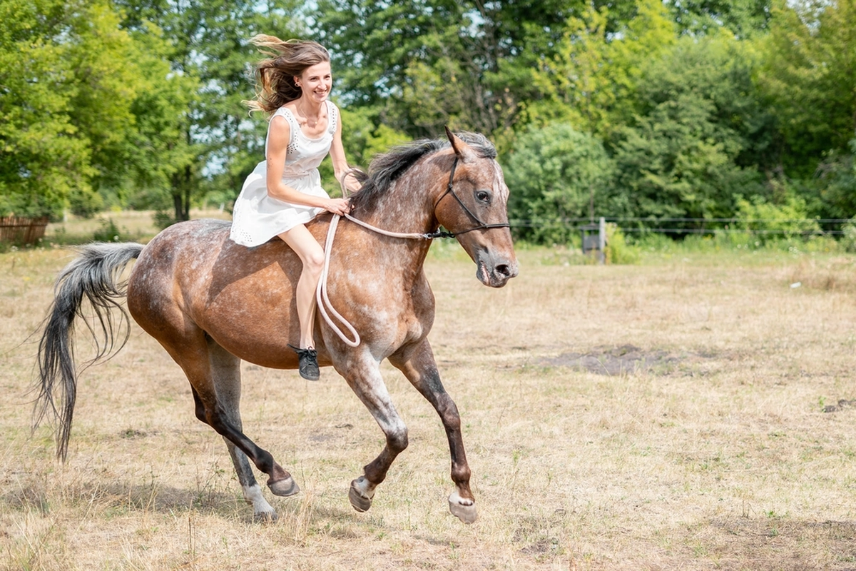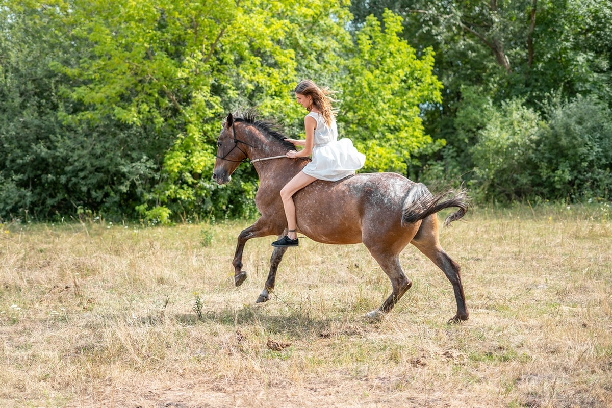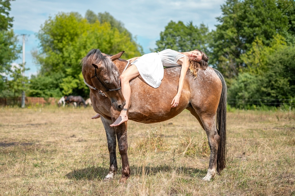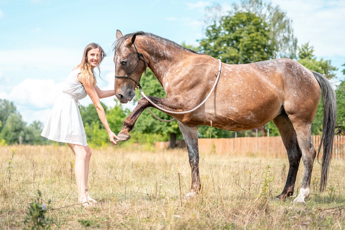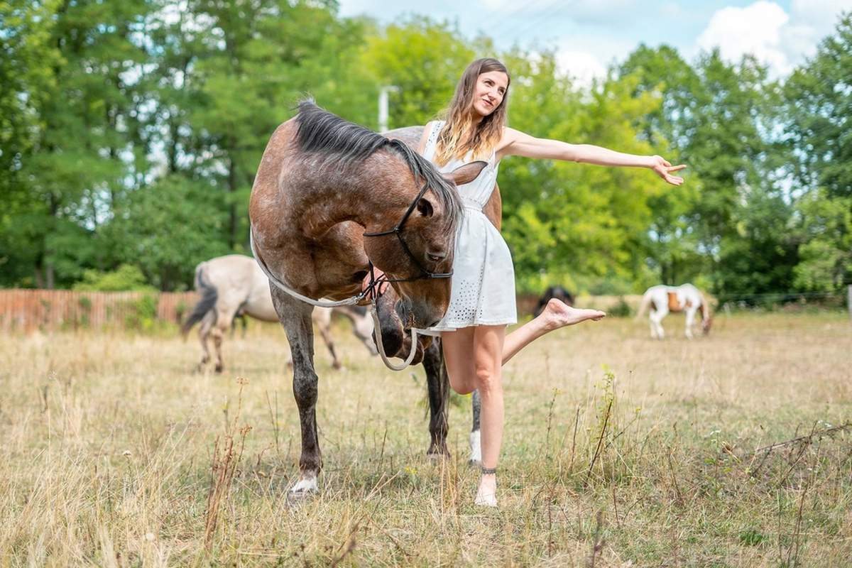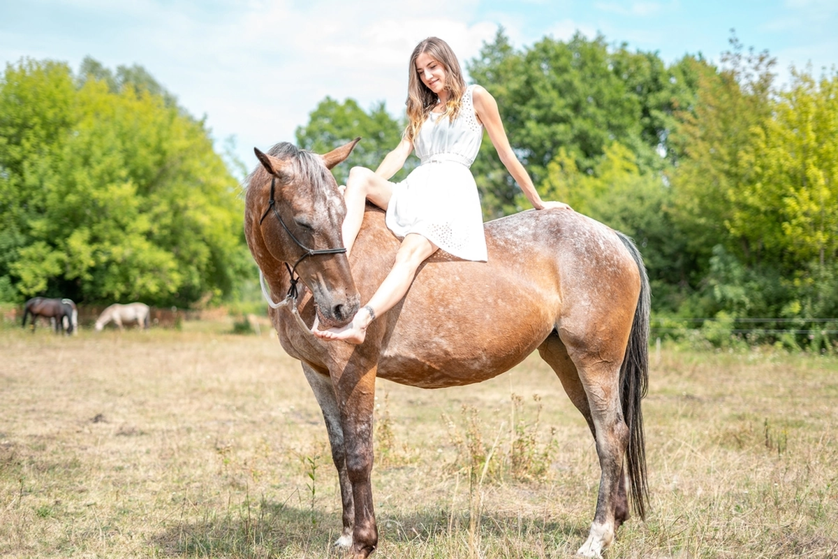 Moja koleżanka Marta trzyma swoją klacz w przydomowej stajni, gdzie w okolicy jest kilka domów i ogromne pola. Kiedy zaproponowałam sesję zdjęciową, od razu była chętna. Długo zgrywałyśmy wolne terminy i w końcu się udało. W dniu sesji była piękna słoneczna pogoda (udało mi się zabrać asystenta do pomocy), przyjechaliśmy na miejsce, Marta poszła wyczyścić konia, ja rozejrzałam się po okolicy, żeby znaleźć najlepsze miejsce na zdjęcia, a asystent rozkładał sprzęt (aparat, blenda). Stwierdziłyśmy z Martą, że łąka, na której były puszczone wszystkie konie, będzie dodawać fajnego klimatu „wolności” i właśnie tam zrobiłyśmy zdjęcia. Marta założyła białą sukienkę, wzięłyśmy Hanię i chciałyśmy kawałek odejść od koni, ale kiedy zaczęłyśmy iść, pozostałe konie zaczęły iść za nami. Podczas zdjęć, w pewnych momentach konie podchodziły do nas, przeszkadzały i zaczepiały Hanie, ale dzięki pomocy asystenta, który odganiał stado, ja mogłam swobodnie robić zdjęcia. Marta była uśmiechnięta, pozytywnie nastawiona, za to Hania odmawiała współpracy na wszystkie sposoby, chociaż często zmieniała zdanie po kawałku marchewki czy jabłka. Sesja trwała około godziny, zrobiłam bardzo dużo ujęć, wszyscy byli zadowoleni, skończyliśmy, spakowałam się, a po powrocie do domu zaczęłam przebierać zdjęcia.