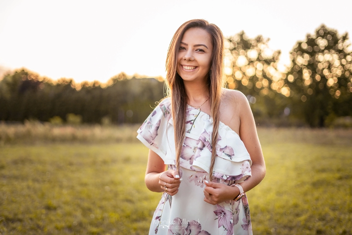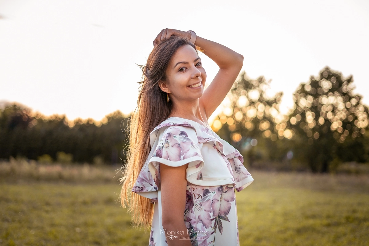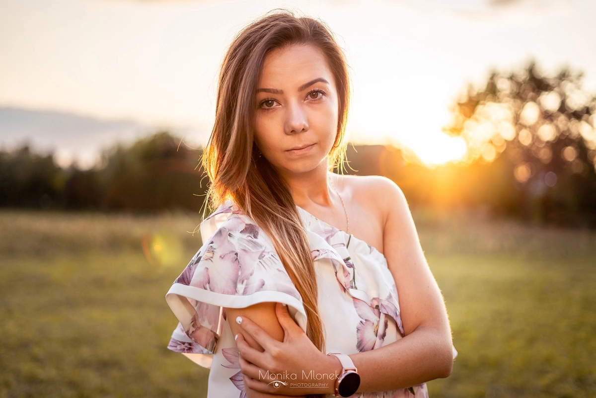 Jest to kontynuacja zdjęć „Sesja na rocznicę ślubu”. Jak pisałam w poprzednim wpisie, cała sesja trwała około 3 godziny i była podzielona na dwie części, pierwsza część to zdjęcia rocznicowe pary, a druga to portret indywidualny. Kiedy słońce zaczęło zachodzić, zaczęłam robić portrety Magdzie. Chciałam przede wszystkim pokazać jej naturalną urodę, która idealnie komponowała się z zachodem słońca oraz garderobą. Mówi się, że oczy są zwierciadłem duszy, ja jako artysta jak najbardziej w to wierzę, dlatego robiąc zdjęcia zwracam dużą uwagę czy aparat łapie ostrość właśnie na oczy. Sesja trwała bardzo długo, od zachodu aż do zmroku, dzięki czemu mam wiele niecodziennych, ciekawych ujęć. Zakończyliśmy zdjęcia około 21:00, wróciłam do domu i zgrałam zdjęcia z karty SD na dysk zewnętrzny, a następnego dnia zaczęłam segregację. Obróbka trwała długo, około dwa tygodnie, ponieważ miałam ogromną ilość zdjęć do segregacji (prawie 1000 zdjęć z sesji) i obróbki. Końcowy efekt bardzo podobał się Magdzie i jej mężowi, a to mnie najbardziej cieszy.